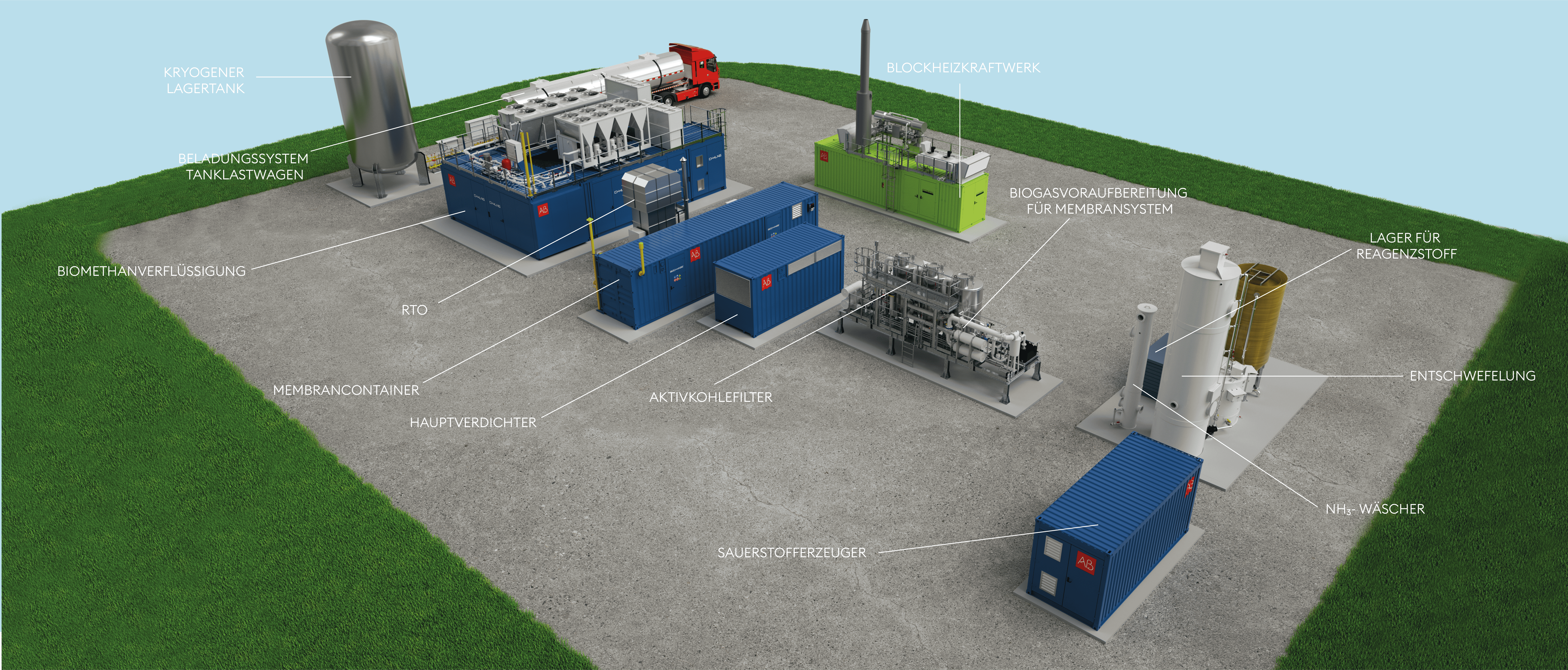 Mit AB können Sie ein komplettes und nachhaltiges Energiesystem aufbauen, dass Biogasaufbereitung, Biomethan- und CO₂ -Verflüssigung, Kraft-Wärme-Kopplung und durch ein umfassendes Angebot anZusatzleistungen unterstützt wird: von der Machbarkeitsstudie über Errichtung und Betrieb bis hin zur Wartung.