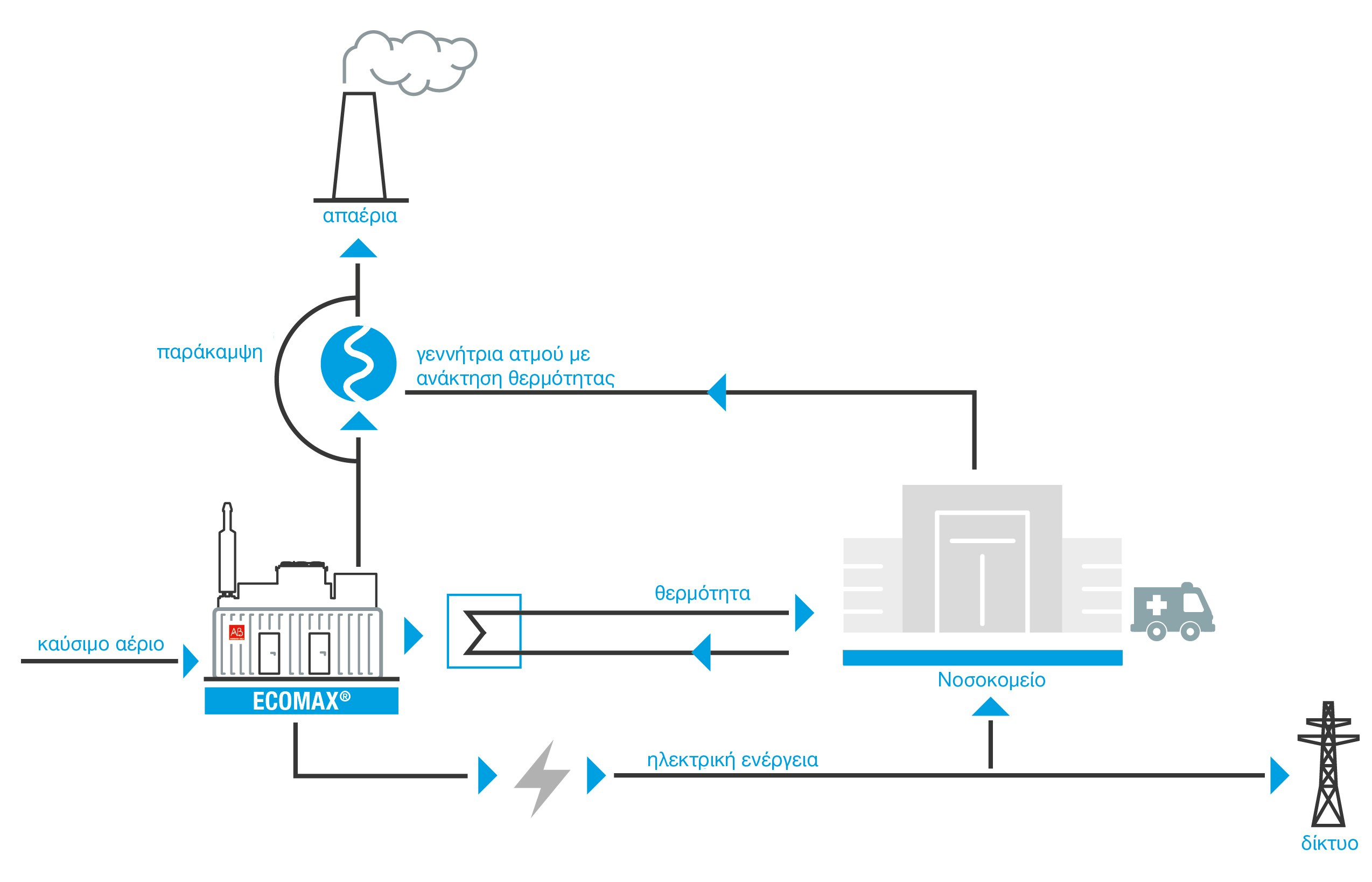 Οι λύσεις ΑΒ ανταποκρίνονται σε μια τυπική απαίτηση στον τομέα της υγειονομικής περίθαλψης: την παροχή σταθερών ενεργειακών φορτίων, με συνεχείς ημερήσιους ρυθμούς, που επιτρέπουν την αδιάλειπτη λειτουργία της νοσοκομειακής δομής.
