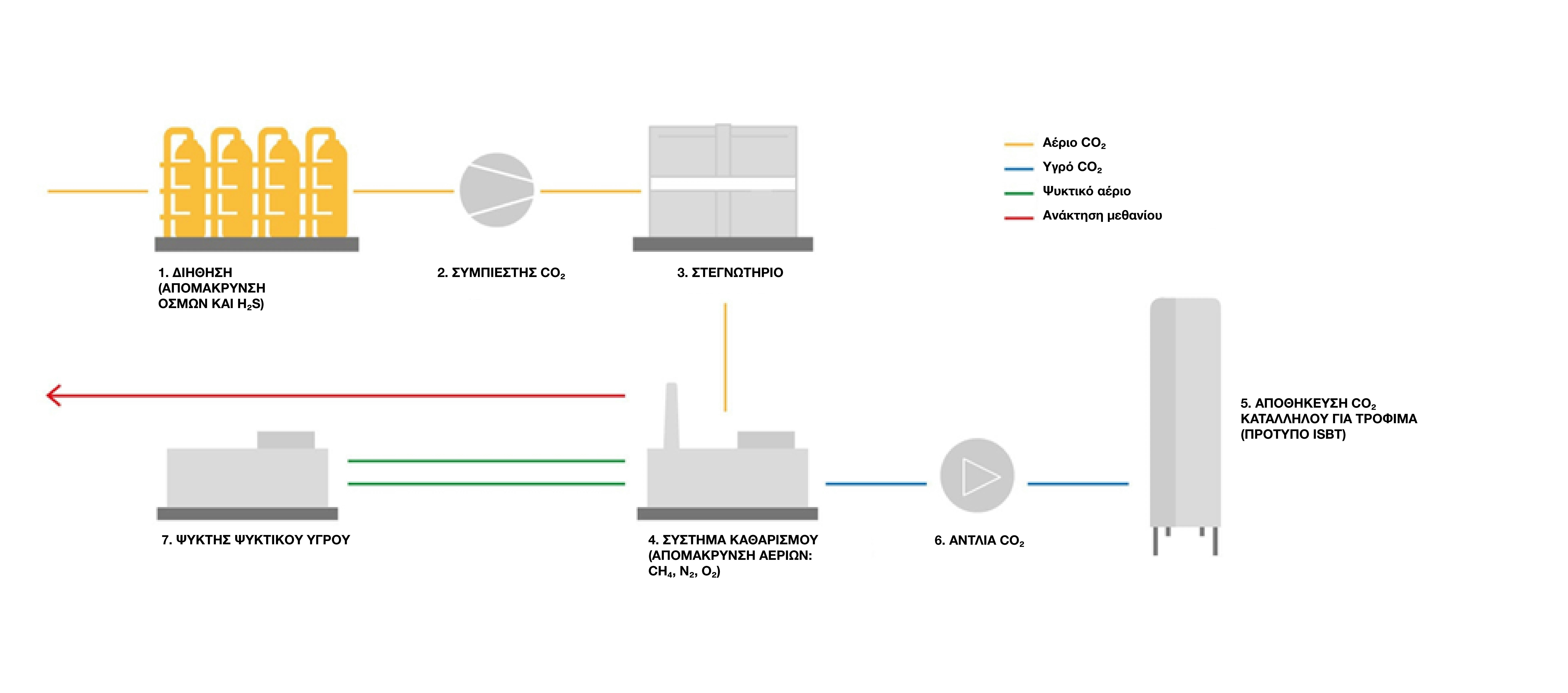 Κρυογενική απόσταξη: τα ξένα αέρια (CH₄, N₂, O₂) που υπάρχουν στο εισερχόμενο μείγμα διαχωρίζονται από το διοξείδιο του άνθρακα με τη βοήθεια της τεχνολογίας κρυογενικής απόσταξης, η οποία επιτρέπει τη λήψη CO₂ με περιεκτικότητα μεγαλύτερη από 99,9% στην έξοδο του συστήματος, όπως απαιτείται από την ISBT.