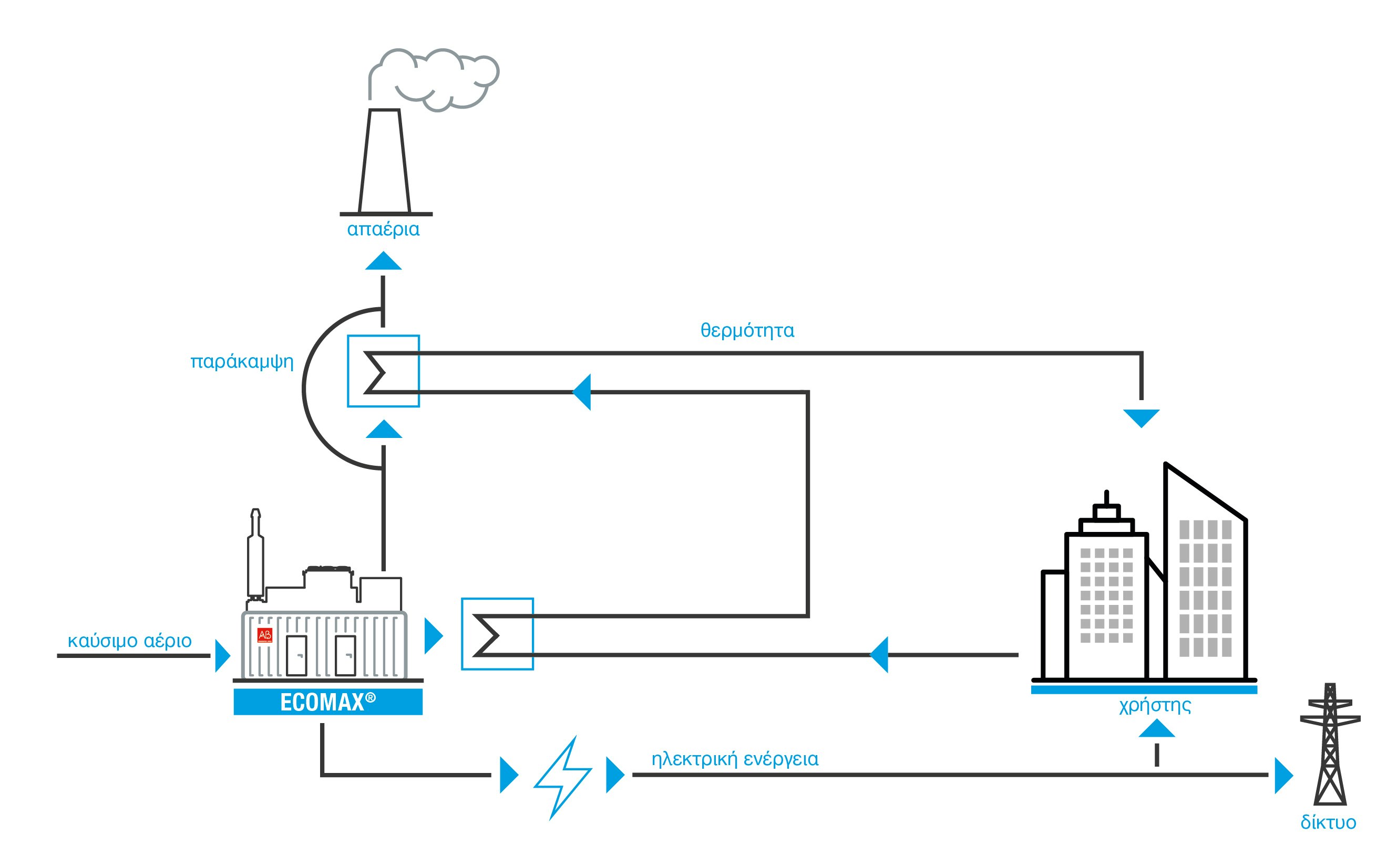 Οι σταθμοί κεντρικής ψύξης και τριπαραγωγής επιτρέπουν τη χρήση της πλεονάζουσας θερμότητας και για την παραγωγή κρύου νερού μέσω ψύκτη απορρόφησης. Οι σταθμοί συμπαραγωγής έχουν πολύ υψηλή απόδοση μετατροπής (> 90%), επομένως μακροπρόθεσμα εξοικονομούν λειτουργικό κόστος.