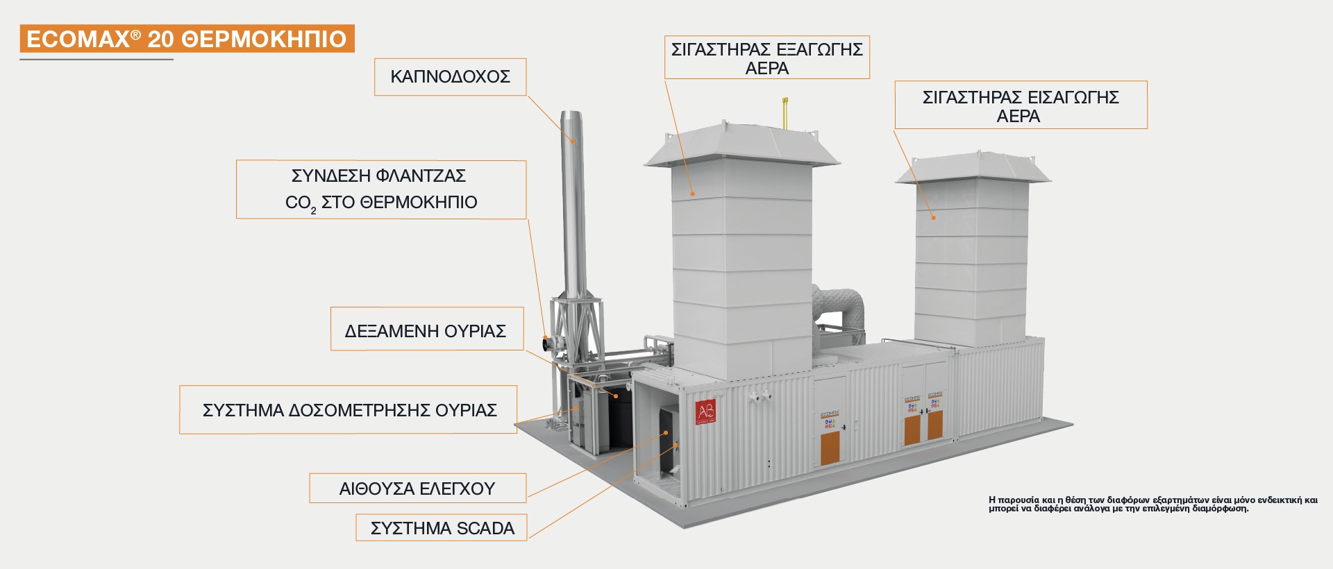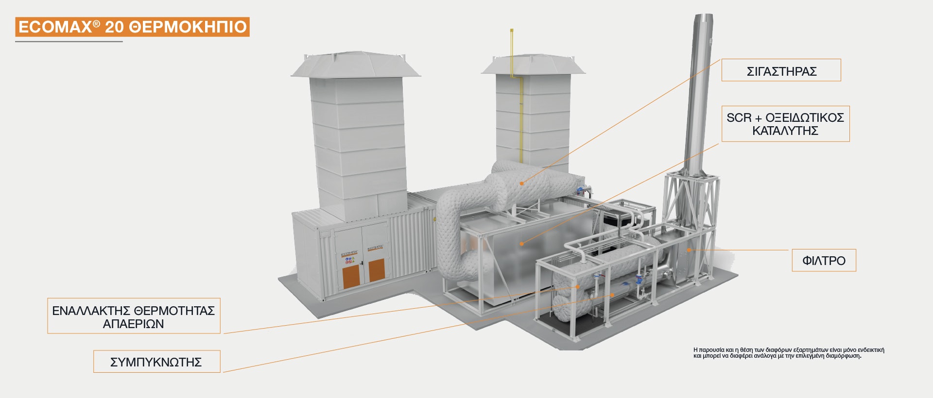 Η λύση ECOMAX® Θερμοκήπιο προσφέρει σταθμούς συμπαραγωγής που εγγυώνται την παραγωγή ηλεκτρικής και θερμικής ενέργειας και CO₂.