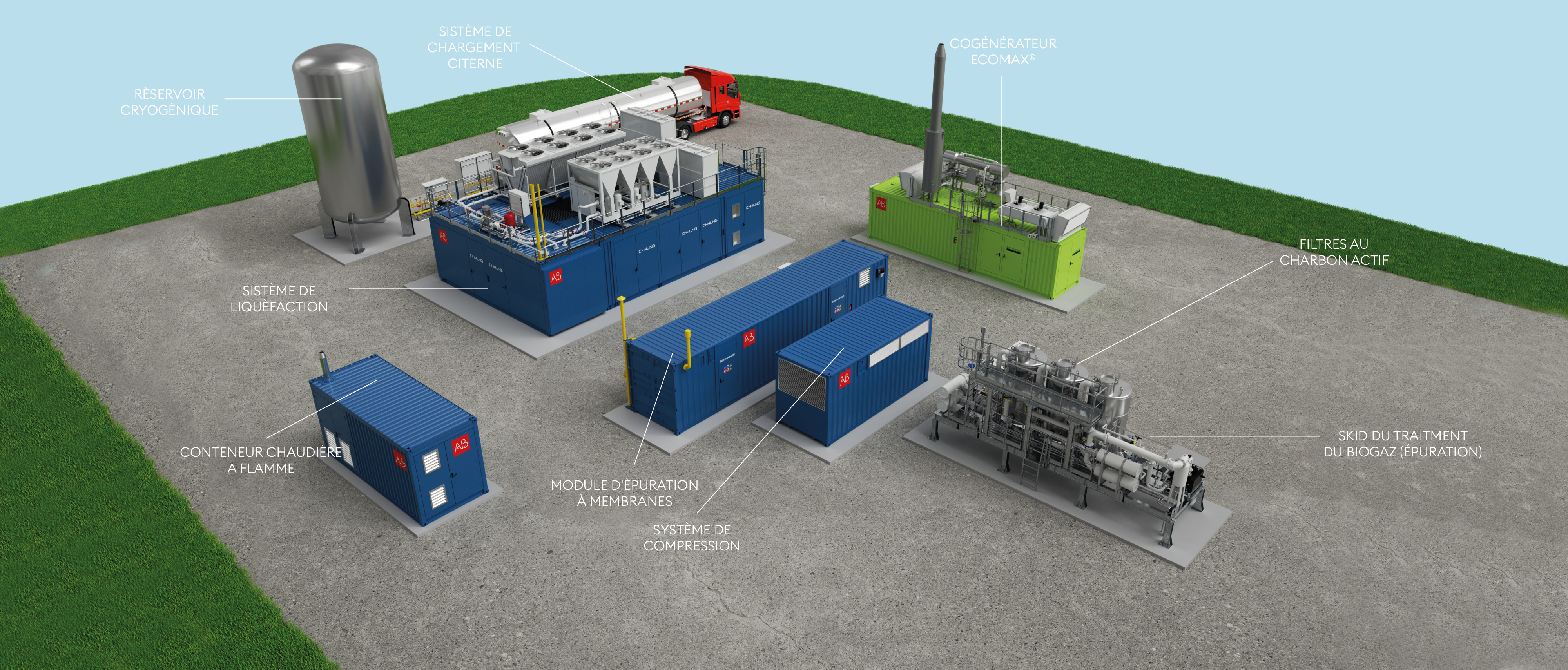 Si l’injection du biométhane produit dans le réseau n’est pas possible, le biométhane peut être liquéfié pour être transporté par camion. A cet effet, AB a créé CH4LNG, la solution de liquéfaction du biométhane, conçue pour être installée en aval d’un système BIOCH4NGE®, auquel elle s’intègre à la perfection.