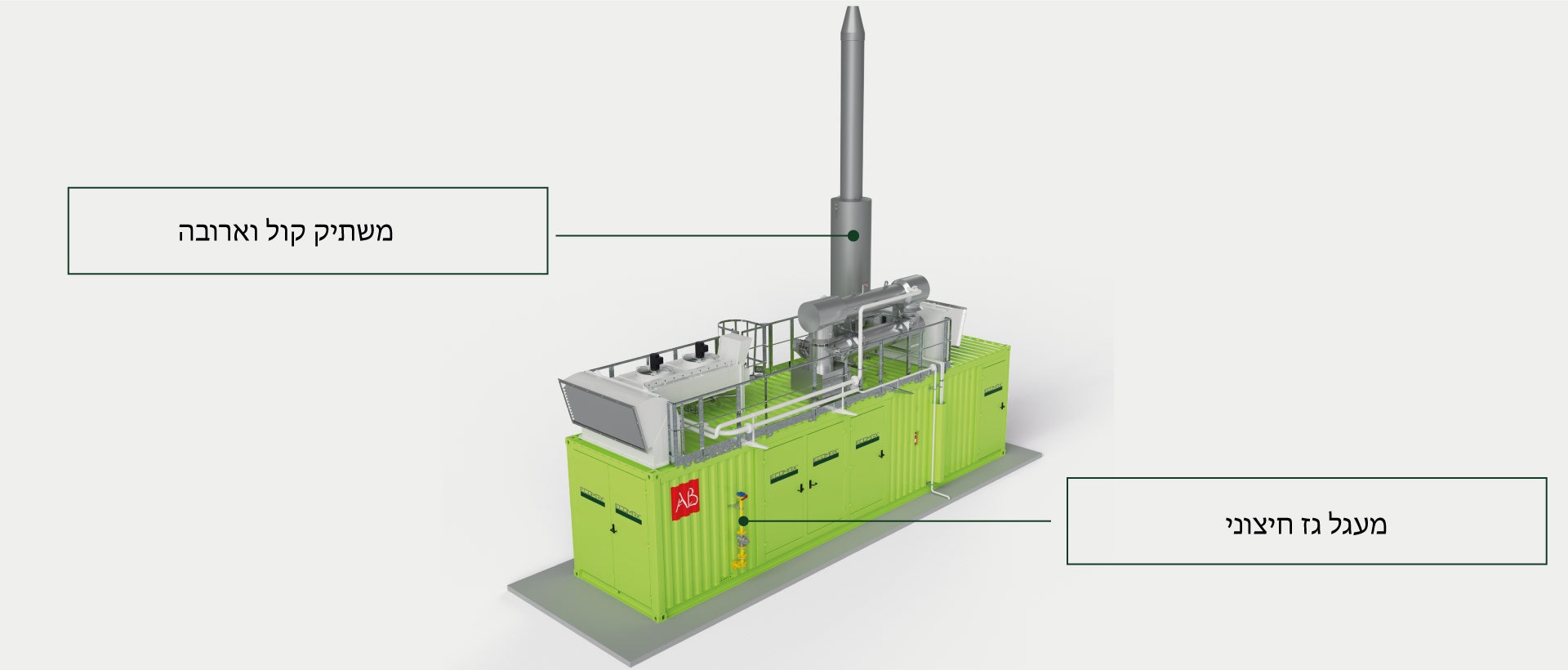 מתקן ECOMAX® המופעל על ביוגז מורכב משני חלקים: חלק התסיסה האנאירובית, שבו מתבצעת ייצור הביוגז בפועל, וחלק המרה של הביוגז לאנרגיה, כלומר מתקן הקוגנרציה.